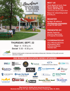 Mandan’s downtown walking tour and networking social will be held Thursday, Sept. 22 with tours beginning at 4 p.m. A networking social will follow. Anyone interested in taking a closer look at downtown places and spaces is welcome to attend.