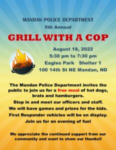 Calendar Add to Calendar Add to Timely Calendar Add to Google Add to Outlook Add to Apple Calendar Add to other calendar Export to XML When: August 18, 2022 @ 5:30 pm – 7:30 pm 2022-08-18T17:30:00-05:00 2022-08-18T19:30:00-05:00 Where: Eagles Park, Shelter 1 100 14th St NE Mandan ND 58554 Cost: Free Contact: Mandan Police Department 701-667-3250 City of Mandan General Community Click here to view the event flyer.