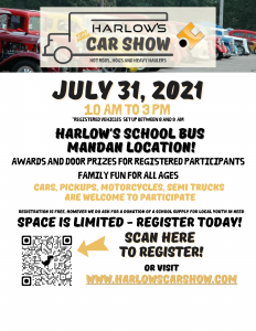 Harlow’s School Bus is hosting its first ever car, truck, motorcycle and semi show! Join us, July 31 at our Harlow’s Mandan location. Registration is free, however we ask registered participants bring a school supply for local youth in need. Interested in being an event sponsor? Give us a call at 701-498-3004 for more information. SPACE IS LIMITED – REGISTER TODAY AT WWW.HARLOWSCARSHOW.COM