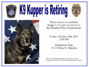 Calendar Add to Calendar Add to Timely Calendar Add to Google Add to Outlook Add to Apple Calendar Add to other calendar Export to XML When: October 10, 2025 @ 2:00 pm 2025-10-10T14:00:00-05:00 2025-10-10T14:15:00-05:00 Where: Dykshoorn Park Contact: Mandan Police Department 701-667-3250 Event website City of Mandan General Community