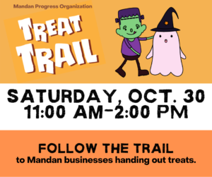 The Mandan Progress Organization welcomes our youngest shoppers and their guardians to participate in the third annual Treat Trail on Saturday, Oct. 30 from 11:00 a.m.-2:00 p.m. Celebrate the season in spooktacular fashion by visiting local businesses waiting to welcome you with a sweet treat.